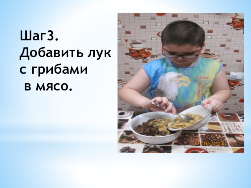 Слайд 6 Шаг3. Добавить лук с грибами в мясо.
