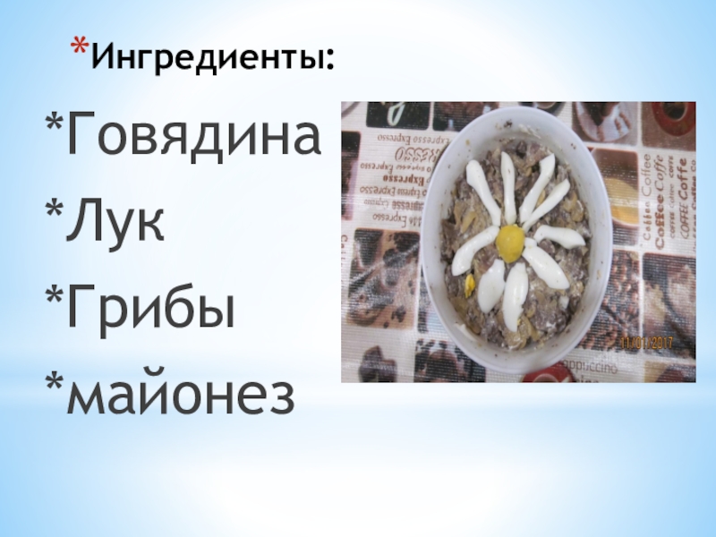 Ингредиенты:*Говядина*Лук*Грибы*майонез