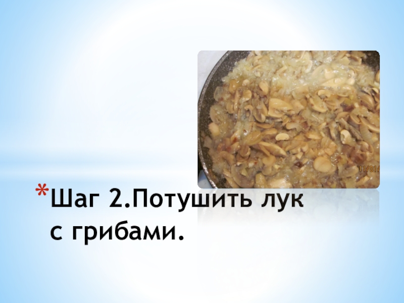 Слайд 5Шаг 2.Потушить лук с грибами.