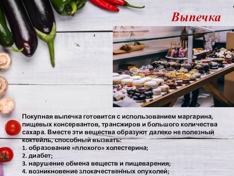 Покупная выпечка готовится с использованием маргарина, пищевых консервантов, трансжиров и большого количества сахара. Вместе эти вещества образуют далеко не полезный коктейль, способный вызвать: