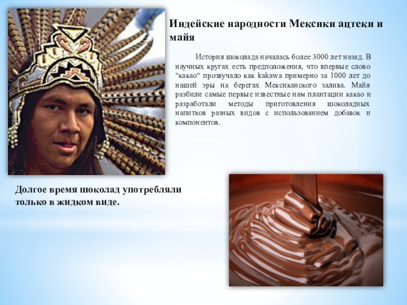 История шоколада началась более 3000 лет назад. В научных кругах есть предположения, что впервые слово "какао" прозвучало как kakawa примерно за 1000 лет до нашей эры на берегах Мексиканского залива. Майя разбили самые первые известные нам плантации какао и разработали методы приготовления шоколадных напитков разных видов с использованием добавок и компонентов.