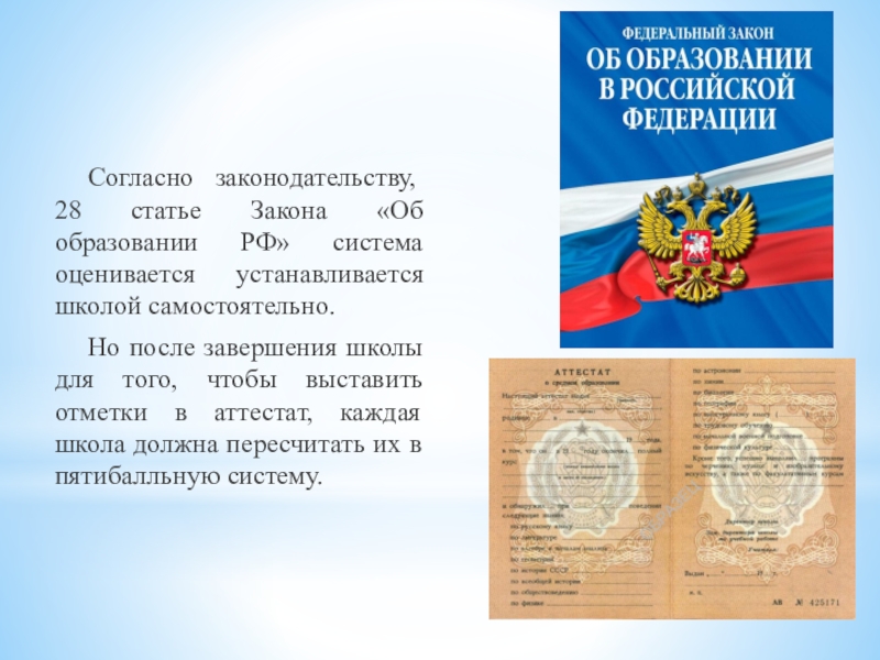 Согласно законодательству, 28 статье Закона «Об образовании РФ» система оценивается