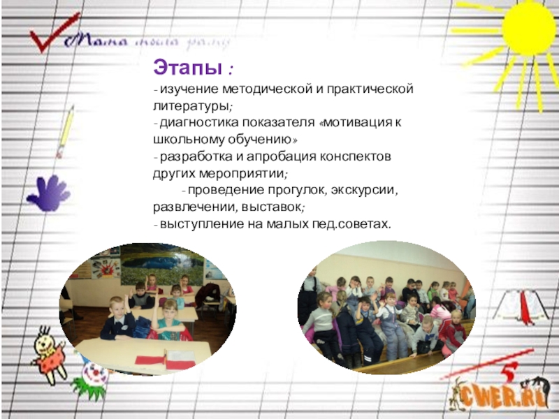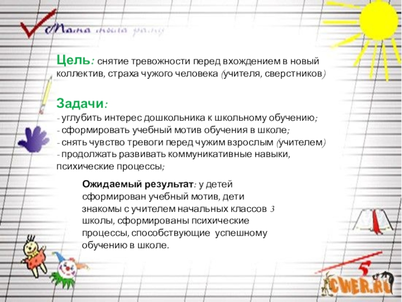 Ожидаемый результат: у детей сформирован учебный мотив, дети знакомы с учителем начальных классов 3 школы, сформированы психические процессы, способствующие успешному обучению в школе.