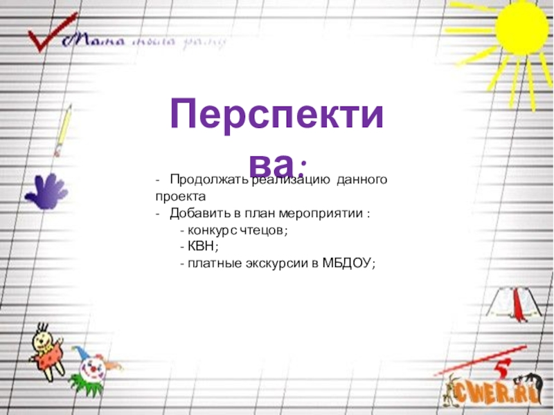 Это сайт презентаций, где можно хранить и обмениваться своими презентациями, докладами, проектами, шаблонами в формате PowerPoint с другими пользователями. Мы помогаем школьникам, студентам, учителям, преподавателям хранить и обмениваться учебными материалами.