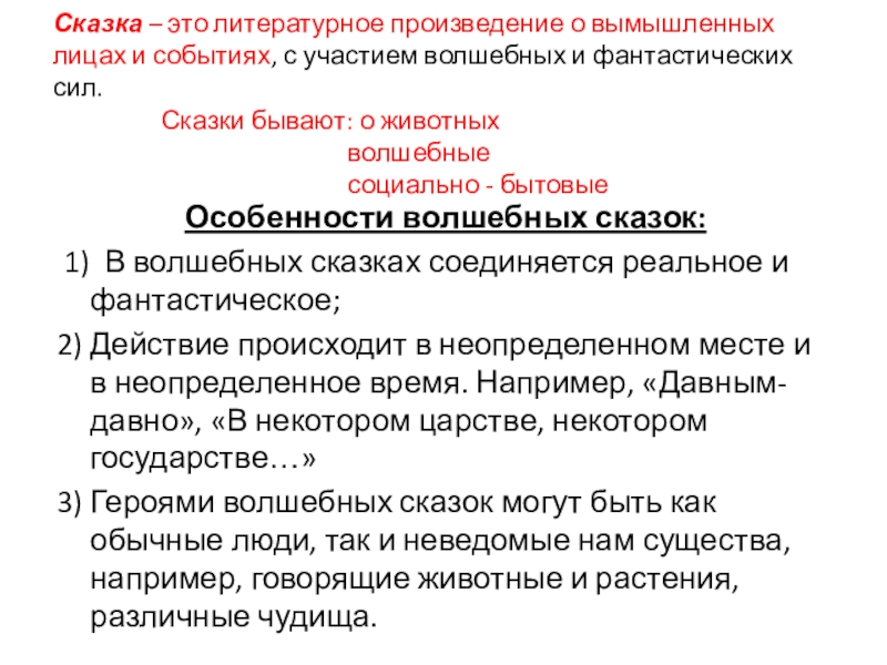 3) Героями волшебных сказок могут быть как обычные люди, так и неведомые нам существа, например, говорящие животные и растения, различные чудища.