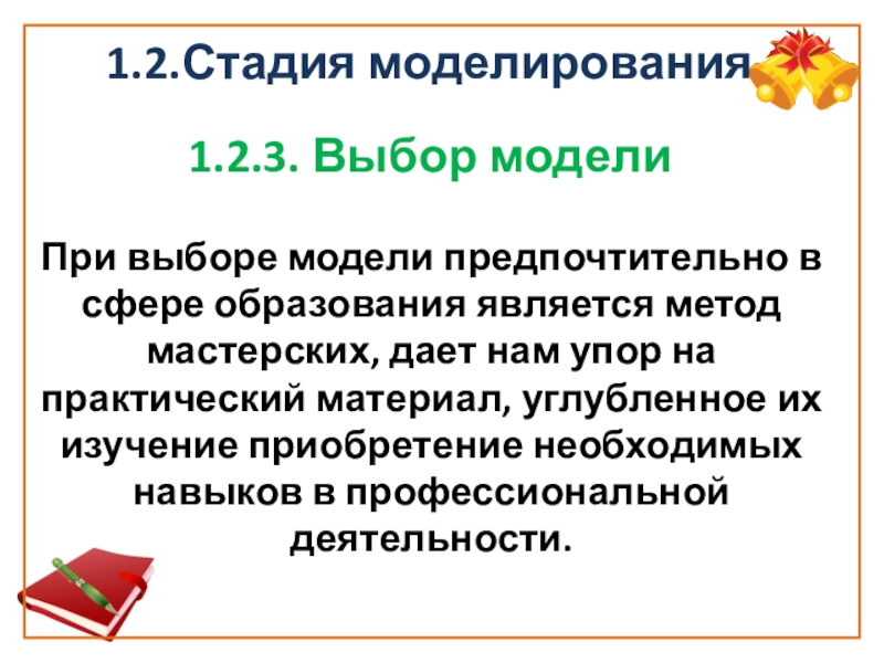 1.2.Стадия моделирования  1.2.3. Выбор модели При выборе модели предпочтительно в сфере образования является метод мастерских,