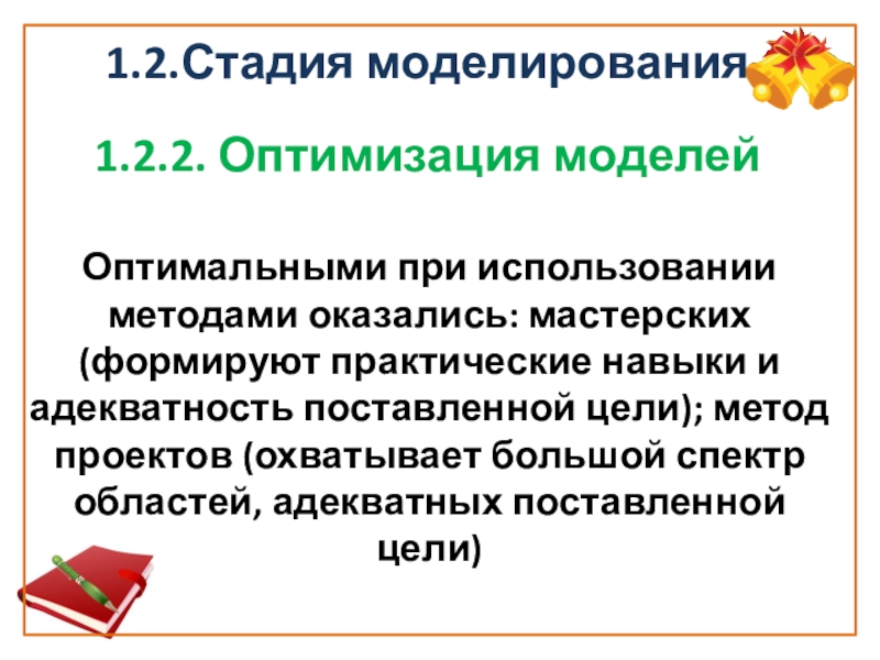 1.2.Стадия моделирования  1.2.2. Оптимизация моделейОптимальными при использовании методами оказались: мастерских (формируют практические навыки и адекватность