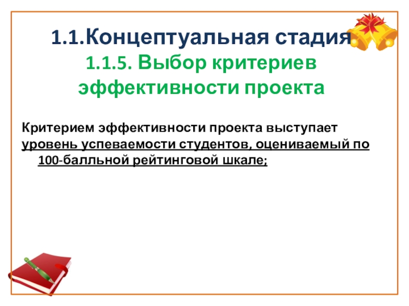 1.1.Концептуальная стадия 1.1.5. Выбор критериев эффективности проекта Критерием эффективности проекта выступает уровень успеваемости студентов, оцениваемый по