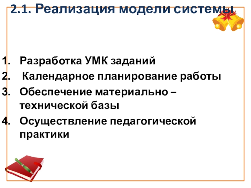 2.1. Реализация модели системы    Разработка УМК заданий Календарное планирование работыОбеспечение материально – технической