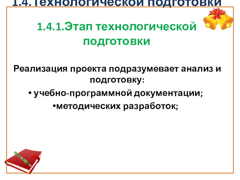 1.4.Технологической подготовки  1.4.1.Этап технологической подготовки  Реализация проекта подразумевает анализ и подготовку:  учебно-программной документации; методических разработок;