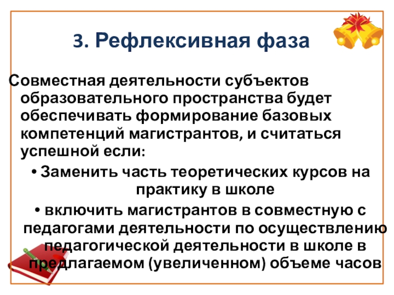 3. Рефлексивная фаза   Совместная деятельности субъектов образовательного пространства будет обеспечивать формирование базовых