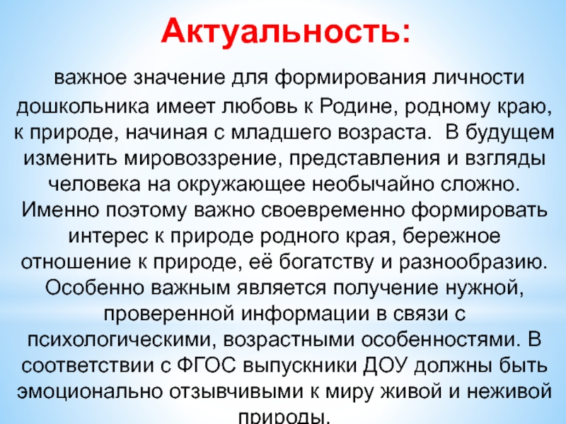 Родине, родному краю, к природе, начиная с младшего возраста. В будущем изменить мировоззрение, представления и взгляды человека на окружающее необычайно сложно. Именно поэтому важно своевременно формировать интерес к природе родного края, бережное отношение к природе, её богатству и разнообразию. Особенно важным является получение нужной, проверенной информации в связи с психологическими, возрастными особенностями. В соответствии с ФГОС выпускники ДОУ должны быть эмоционально отзывчивыми к миру живой и неживой природы.