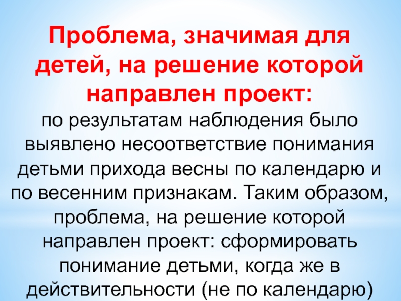 наблюдения было выявлено несоответствие понимания детьми прихода весны по календарю и по весенним признакам. Таким образом, проблема, на решение которой направлен проект: сформировать понимание детьми, когда же в действительности (не по календарю) приходит весна со всеми её характерными признаками.