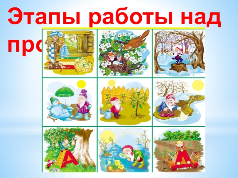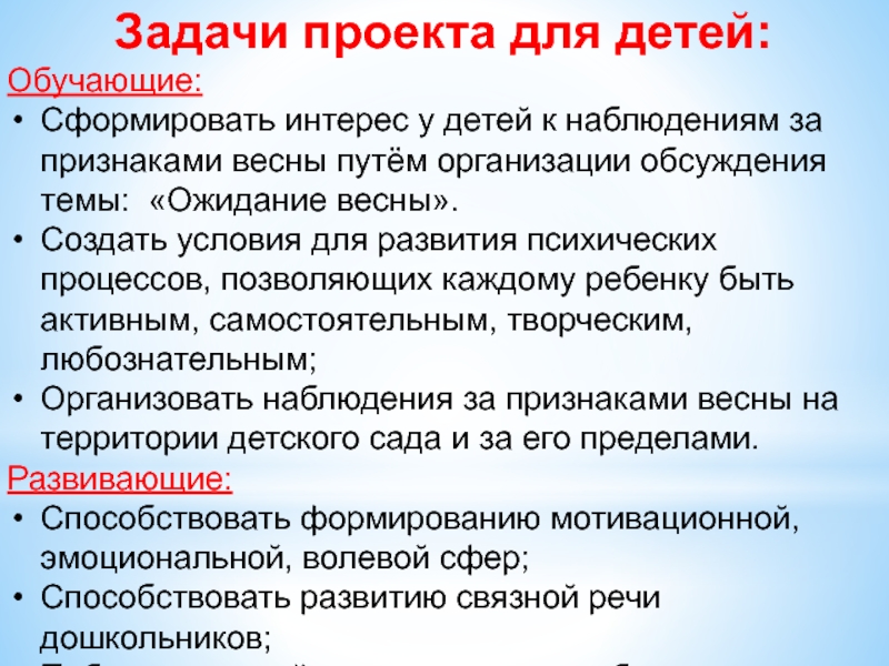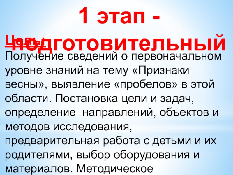 «Признаки весны», выявление «пробелов» в этой области. Постановка цели и задач, определение направлений, объектов и методов исследования, предварительная работа с детьми и их родителями, выбор оборудования и материалов. Методическое обеспечение проекта. Подбор художественной литературы.