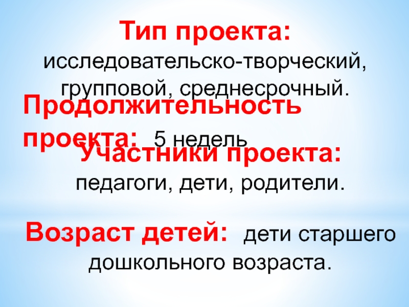 Слайд 2Тип проекта: исследовательско-творческий, групповой, среднесрочный.
