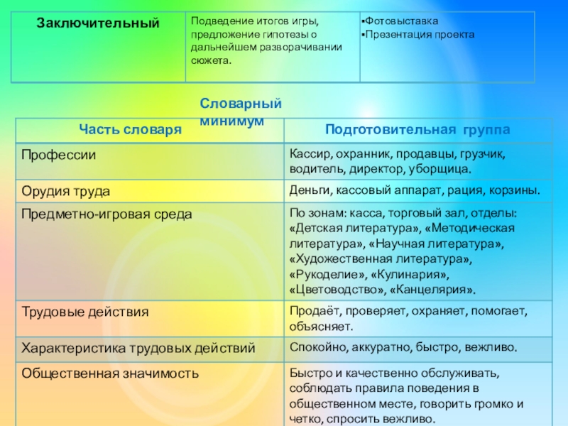 формировать устойчивый интерес к профессии работников торговли и обобщать представления о структуре книжного магазина и об использовании технического прогресса в их труде.