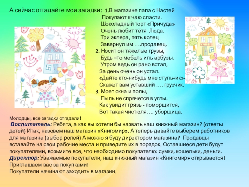 Слайд 8А сейчас отгадайте мои загадки: 1.В магазине папа с Настей