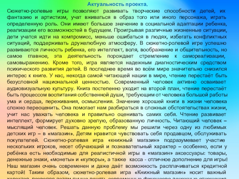 артистизм, учат вживаться в образ того или иного персонажа, играть определенную роль. Они имеют большое значение в социальной адаптации ребенка, реализации его возможностей в будущем. Проигрывая различные жизненные ситуации, дети учатся идти на компромисс, меньше ошибаться в людях, избегать конфликтных ситуаций, поддерживать дружелюбную атмосферу. В сюжетно-ролевой игре успешно развиваются личность ребенка, его интеллект, воля, воображение и общительность, но самое главное, эта деятельность порождает стремление к самореализации, самовыражению. Кроме того, игра является надежным диагностическим средством психического развития детей. В последнее время во всём мире значительно снизился интерес к книге. У нас, некогда самой читающей нации в мире, чтение перестаёт быть безусловной национальной ценностью. Современный человек активно осваивает аудиовизуальную культуру. Книга постепенно уходит на второй план, чтение перестаёт быть процессом воспитания собственной души, требующим от человека большой работы ума и сердца, переживания, осмысления. Значение хорошей книги в жизни человека сложно переоценить. Она помогает нам разбираться в сложных обстоятельствах жизни, учит нас уважать человека и правильно оценивать самих себя. Чтение развивает интеллект, формирует духовно зрелую, образованную личность. Читающий человек – мыслящий человек. Решать данную проблему мы решили через одну из любимых детских игр – в «магазин». Детям нравится чувствовать себя продавцом, обслуживать покупателей. Сюжетно-ролевая игра «книжный магазин» подразумевает участие нескольких игроков, несет обучающий и познавательный характер – особенно, если у ребёнка есть необходимые для реалистичной игры в «магазин» аксессуары: товары, денежные знаки, «монеты» и «купюры», а также касса - отличное дополнение для игры! Наш магазин очень современен и даже даёт возможность расплачиваться кредитной картой! Таким образом, сюжетно-ролевая игра «Книжный магазин» носит важный характер, позволяя детям лучше понять современные финансово-денежные отношения, расплачиваться в магазине и получить «опыт» работы продавцом.