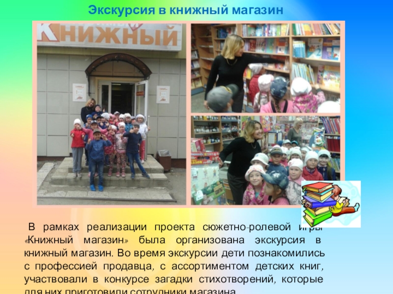 экскурсия в книжный магазин. Во время экскурсии дети познакомились с профессией продавца, с ассортиментом детских книг, участвовали в конкурсе загадки стихотворений, которые для них приготовили сотрудники магазина