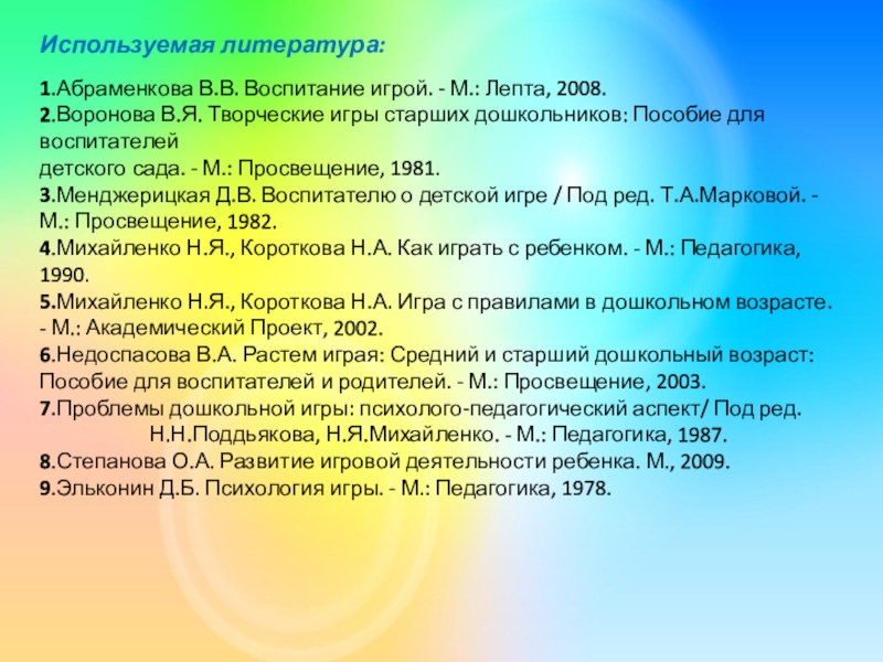 1.Абраменкова В.В. Воспитание игрой. - М.: Лепта, 2008.