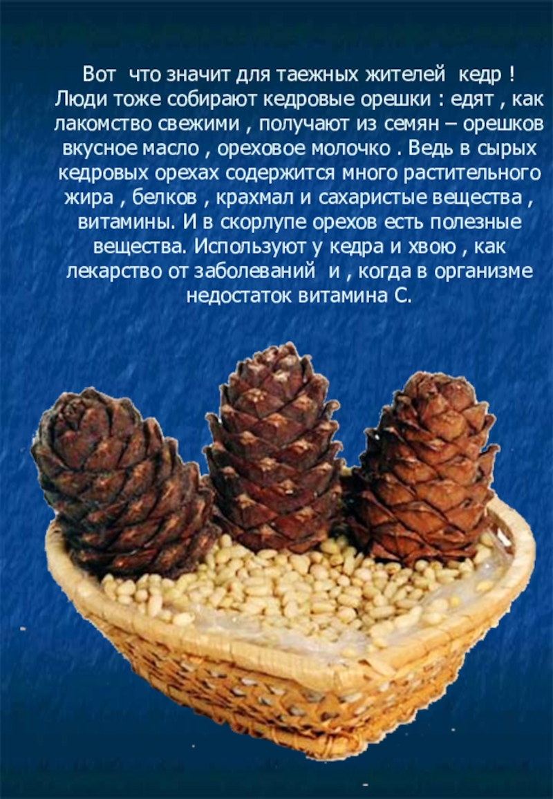 орешки : едят , как лакомство свежими , получают из семян – орешков вкусное масло , ореховое молочко . Ведь в сырых кедровых орехах содержится много растительного жира , белков , крахмал и сахаристые вещества , витамины. И в скорлупе орехов есть полезные вещества. Используют у кедра и хвою , как лекарство от заболеваний и , когда в организме недостаток витамина С.