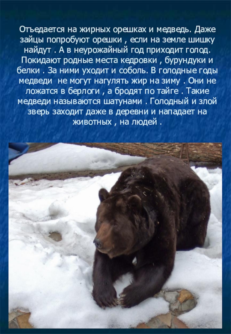 если на земле шишку найдут . А в неурожайный год приходит голод. Покидают родные места кедровки , бурундуки и белки . За ними уходит и соболь. В голодные годы медведи не могут нагулять жир на зиму . Они не ложатся в берлоги , а бродят по тайге . Такие медведи называются шатунами . Голодный и злой зверь заходит даже в деревни и нападает на животных , на людей .