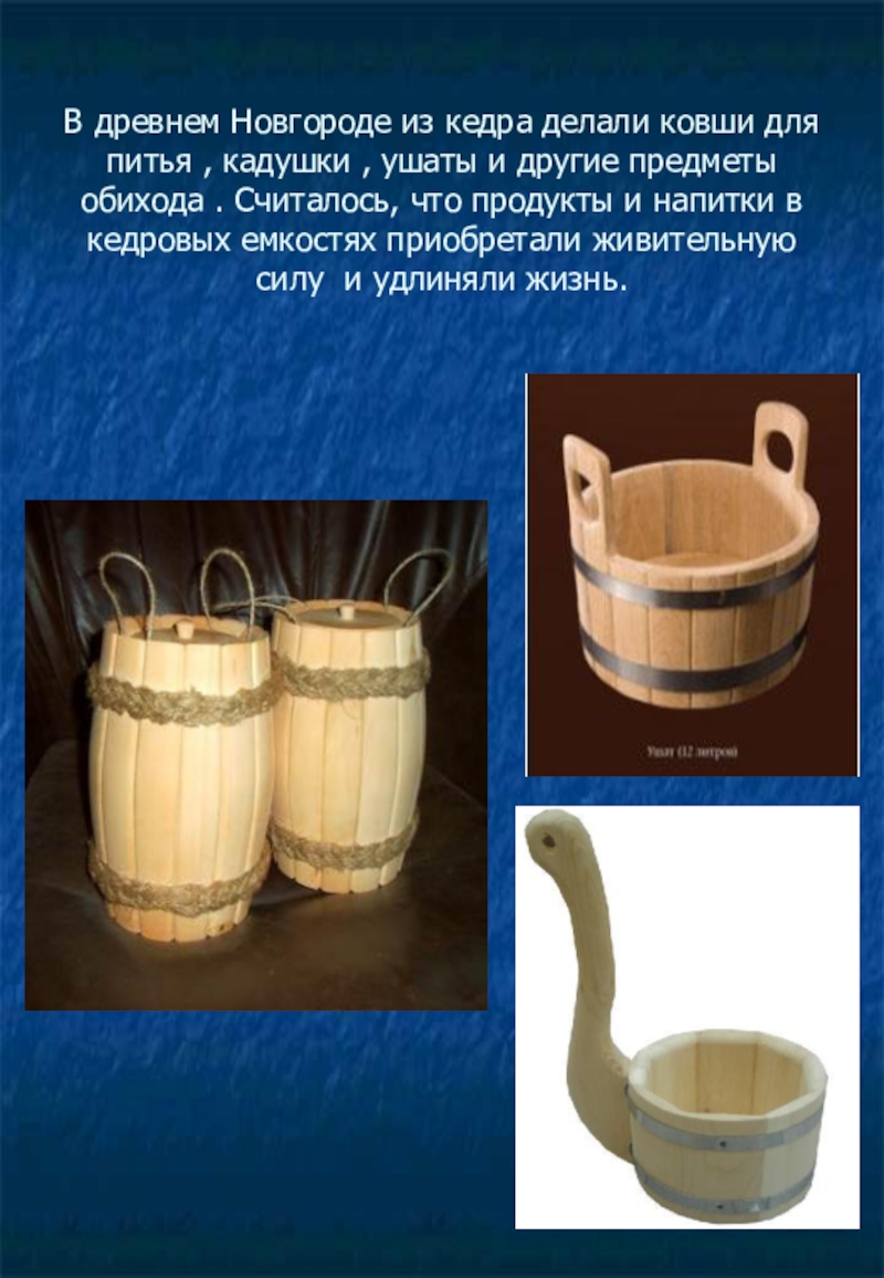Слайд 14В древнем Новгороде из кедра делали ковши для питья , кадушки