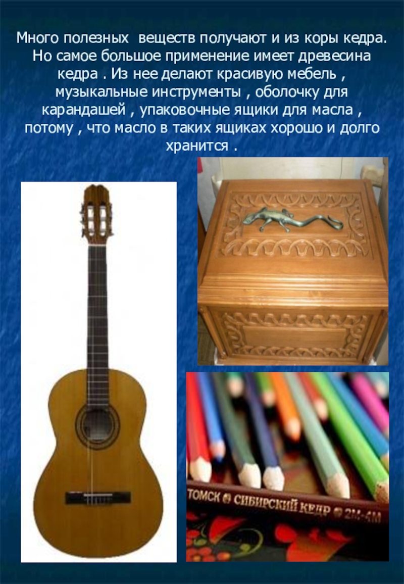 применение имеет древесина кедра . Из нее делают красивую мебель , музыкальные инструменты , оболочку для карандашей , упаковочные ящики для масла , потому , что масло в таких ящиках хорошо и долго хранится .