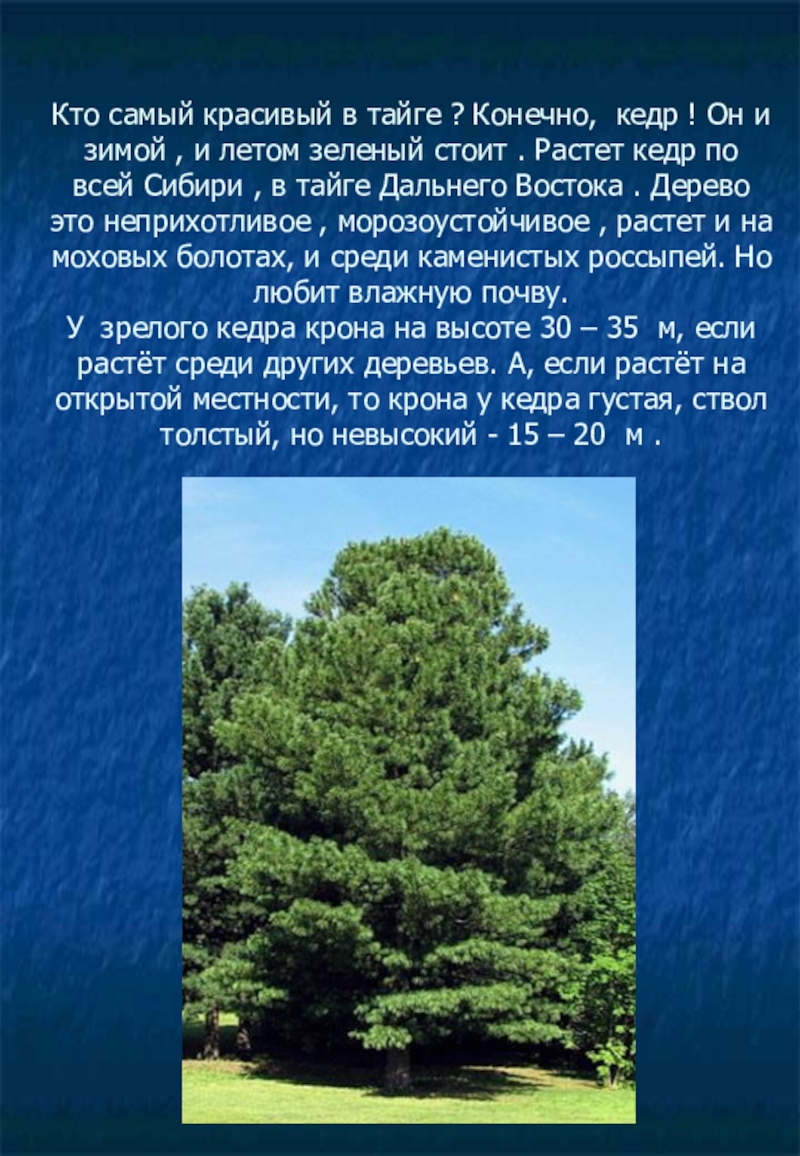 зимой , и летом зеленый стоит . Растет кедр по всей Сибири , в тайге Дальнего Востока . Дерево это неприхотливое , морозоустойчивое , растет и на моховых болотах, и среди каменистых россыпей. Но любит влажную почву.