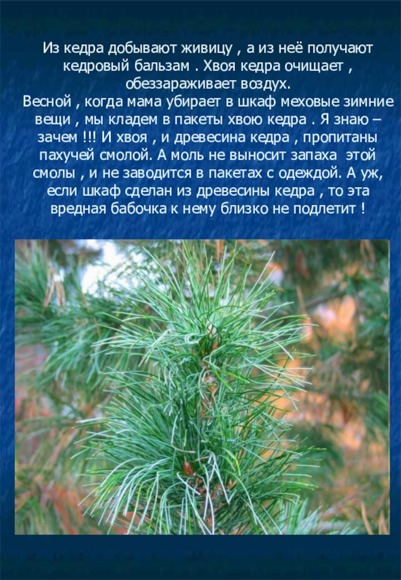 Весной , когда мама убирает в шкаф меховые зимние вещи , мы кладем в пакеты хвою кедра . Я знаю – зачем !!! И хвоя , и древесина кедра , пропитаны пахучей смолой. А моль не выносит запаха этой смолы , и не заводится в пакетах с одеждой. А уж, если шкаф сделан из древесины кедра , то эта вредная бабочка к нему близко не подлетит !