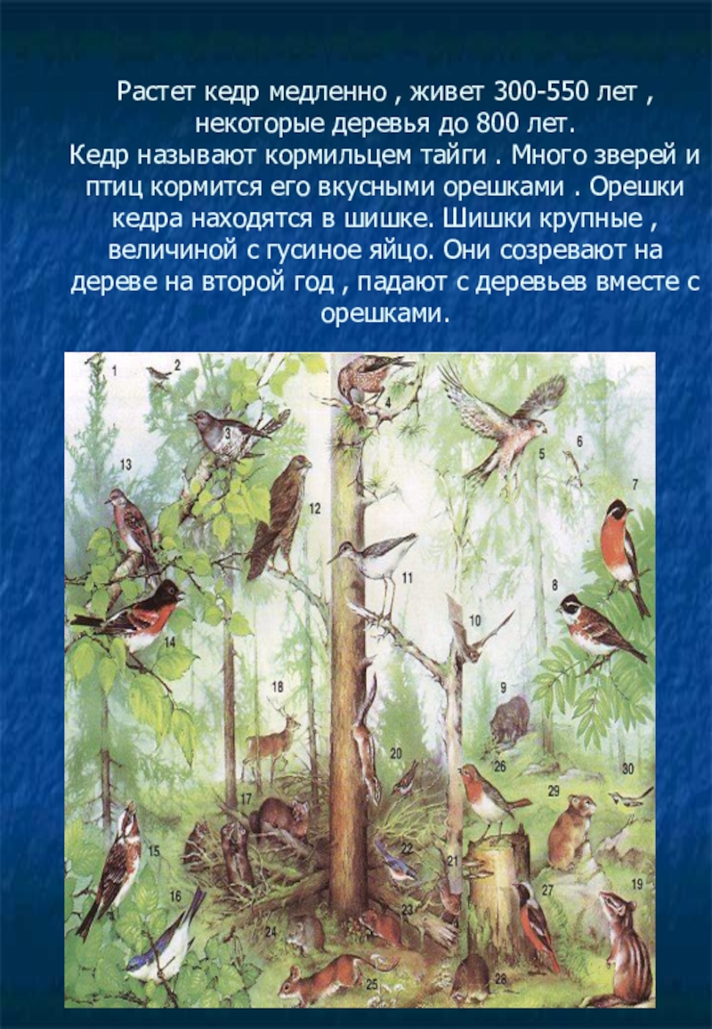 Кедр называют кормильцем тайги . Много зверей и птиц кормится его вкусными орешками . Орешки кедра находятся в шишке. Шишки крупные , величиной с гусиное яйцо. Они созревают на дереве на второй год , падают с деревьев вместе с орешками.