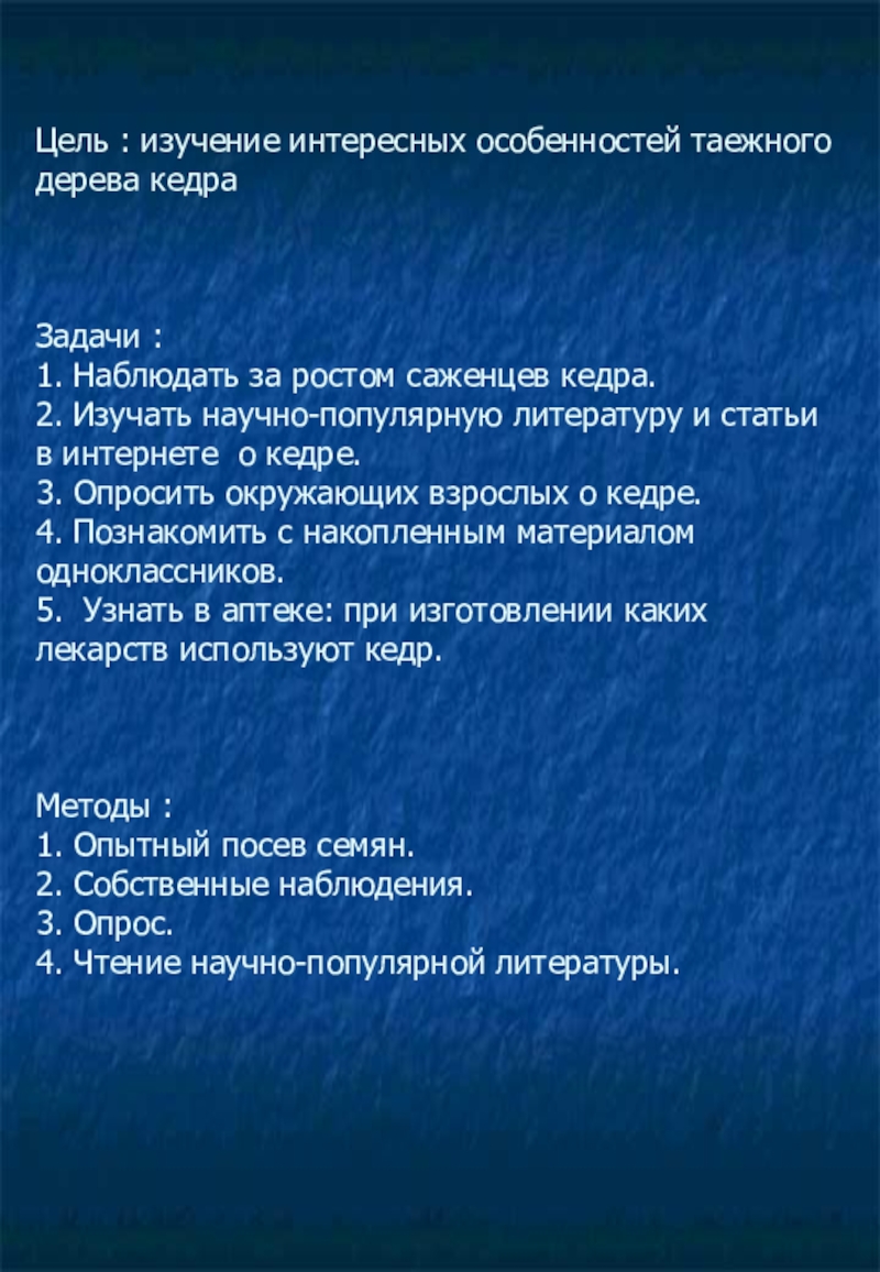 Цель : изучение интересных особенностей таежного дерева кедра