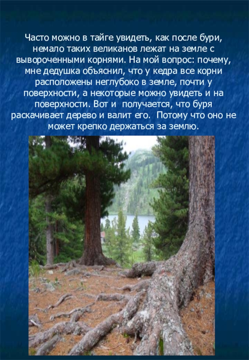 лежат на земле с вывороченными корнями. На мой вопрос: почему, мне дедушка объяснил, что у кедра все корни расположены неглубоко в земле, почти у поверхности, а некоторые можно увидеть и на поверхности. Вот и получается, что буря раскачивает дерево и валит его. Потому что оно не может крепко держаться за землю.