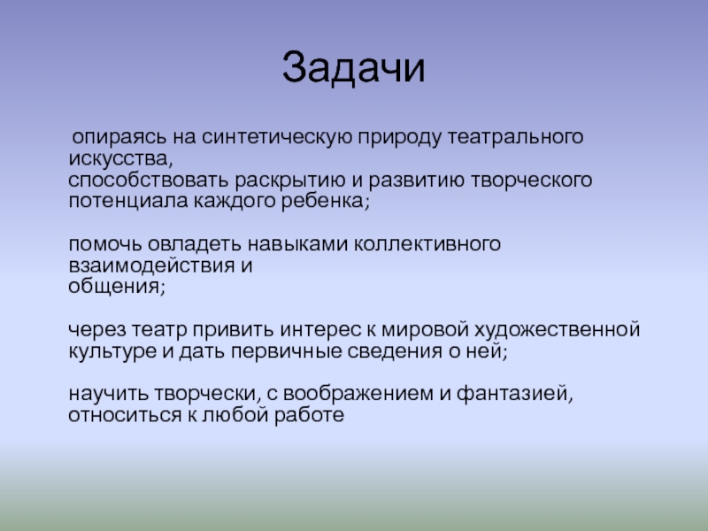 Задачи   опираясь на синтетическую природу театрального искусства,  способствовать раскрытию и развитию творческого потенциала каждого