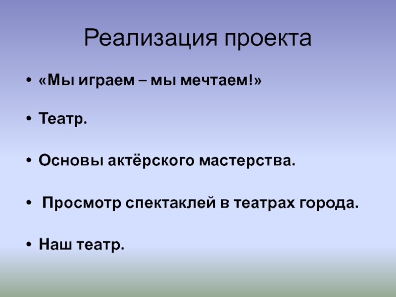 Реализация проекта«Мы играем – мы мечтаем!»  Театр. Основы актёрского мастерства. Просмотр спектаклей в театрах города. Наш