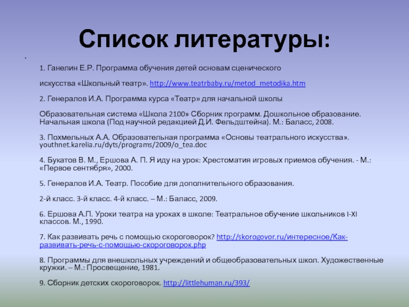 Список литературы:  1. Ганелин Е.Р. Программа обучения детей основам сценического   искусства «Школьный театр». http://www.teatrbaby.ru/metod_metodika.htm