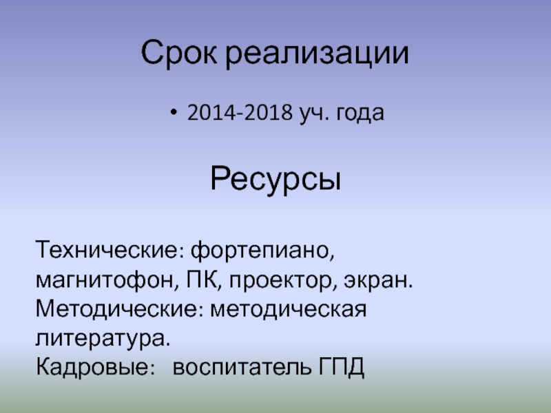 Срок реализации2014-2018 уч. года Ресурсы Технические: фортепиано, магнитофон, ПК, проектор, экран.Методические: методическая литература.Кадровые:  воспитатель ГПД