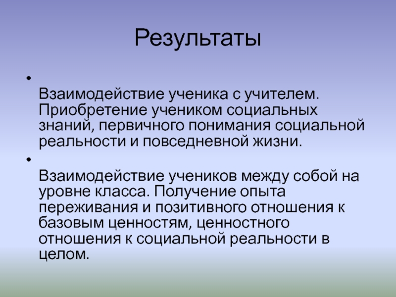 Результаты  Взаимодействие ученика с учителем. Приобретение учеником социальных знаний, первичного понимания социальной реальности и повседневной жизни.