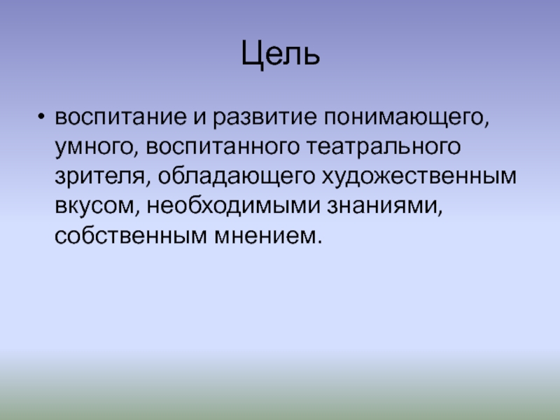 Цель воспитание и развитие понимающего, умного, воспитанного театрального зрителя, обладающего художественным вкусом, необходимыми знаниями, собственным мнением.