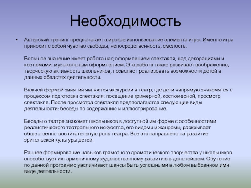 Необходимость Актерский тренинг предполагает широкое использование элемента игры. Именно игра приносит с собой чувство свободы, непосредственность, смелость.