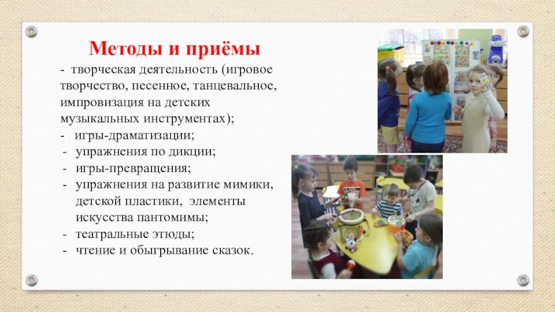 - творческая деятельность (игровое творчество, песенное, танцевальное, импровизация на