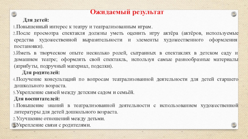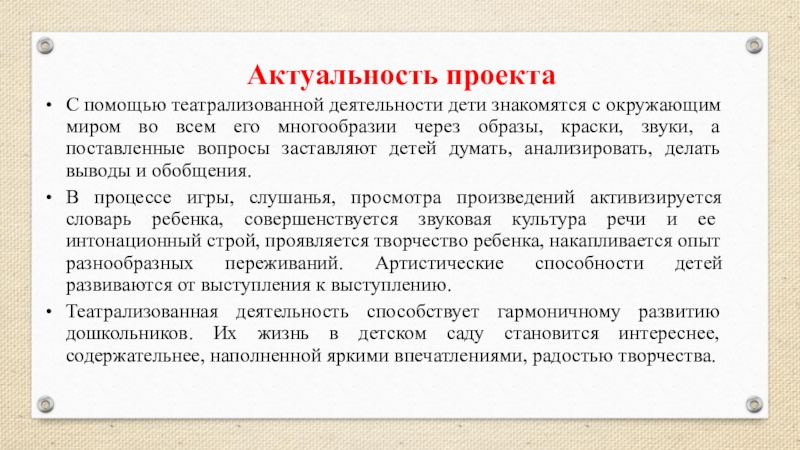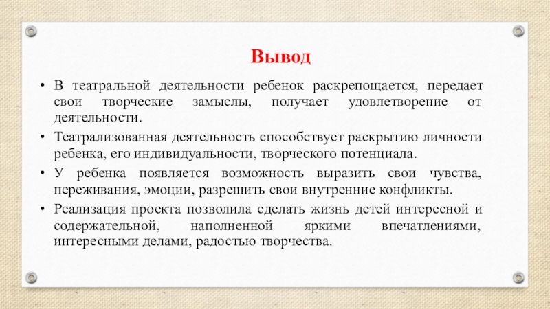Театрализованная деятельность способствует гармоничному развитию дошкольников. Их жизнь в детском саду становится интереснее, содержательнее, наполненной яркими впечатлениями, радостью творчества.
