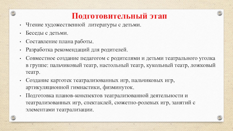 Подготовка планов-конспектов театрализованной деятельности и театрализованных игр, спектаклей, сюжетно-ролевых игр, занятий с элементами театрализации.