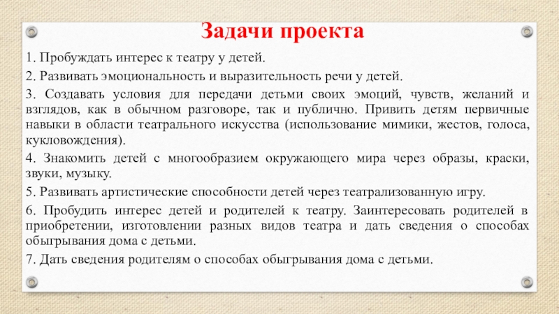 6. Пробудить интерес детей и родителей к театру. Заинтересовать родителей в приобретении, изготовлении разных видов театра и дать сведения о способах обыгрывания дома с детьми.