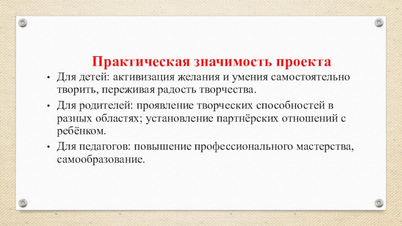 Для детей: активизация желания и умения самостоятельно творить, переживая радость творчества.
