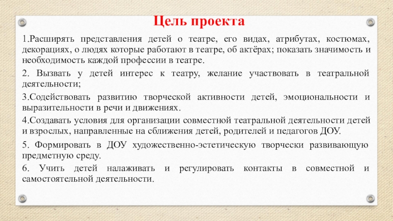 4.Создавать условия для организации совместной театральной деятельности детей и взрослых, направленные на сближения детей, родителей и педагогов ДОУ.