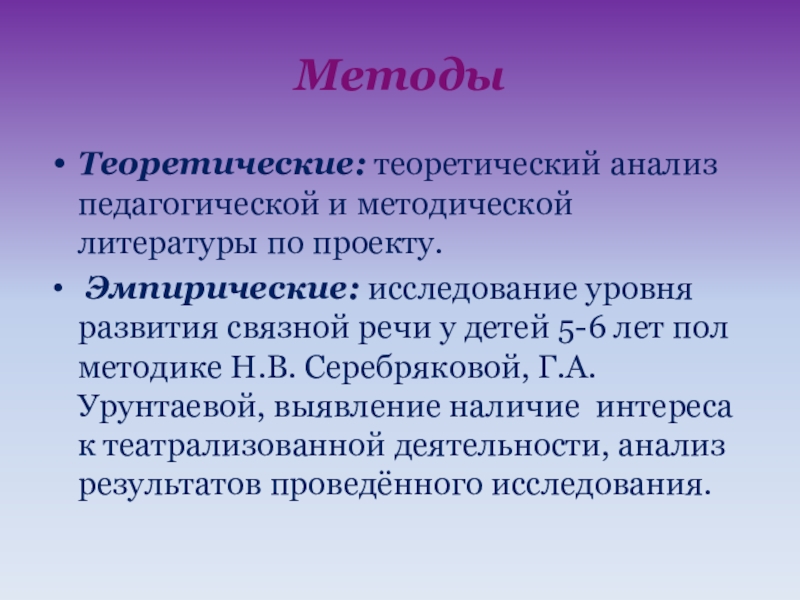 Теоретические: теоретический анализ педагогической и методической литературы по проекту.