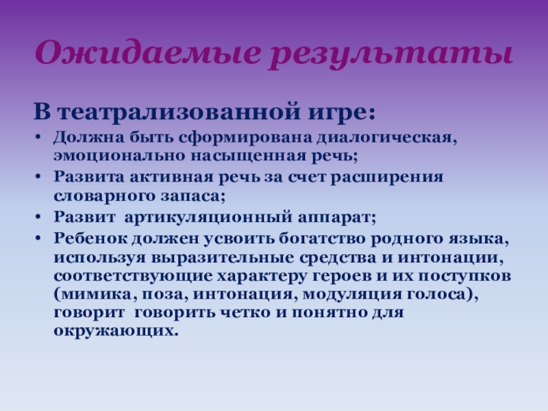 Ребенок должен усвоить богатство родного языка, используя выразительные средства и интонации, соответствующие характеру героев и их поступков (мимика, поза, интонация, модуляция голоса), говорит говорить четко и понятно для окружающих.