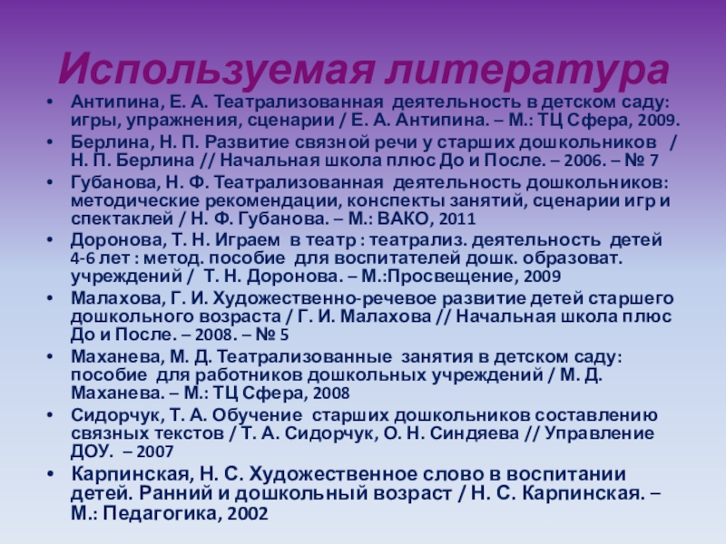Карпинская, Н. С. Художественное слово в воспитании детей. Ранний и дошкольный возраст / Н. С. Карпинская. – М.: Педагогика, 2002