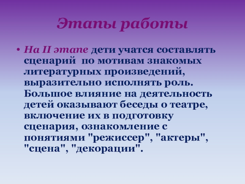 На II этапе дети учатся составлять сценарий по мотивам знакомых